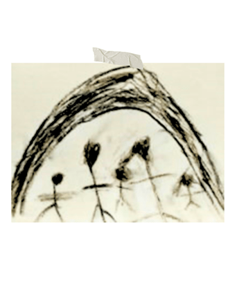 A criança se desenha envolta em uma esfera, pois, até por volta dos quatro anos, o círculo é a forma mais acessível motoramente — aquela que conseguem realizar com maior facilidade. Após conquistar um pouco mais de autonomia, essa cápsula começa a ser substituída por uma forma, ainda circular, que se assenta na borda inferior da folha.