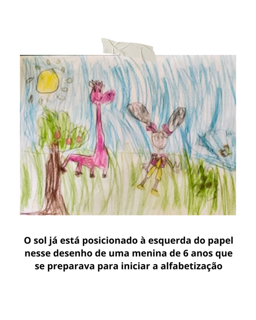A figura do sol geralmente começa a ser desenhada do lado direito da folha e, aos poucos, vai migrando para o lado esquerdo. Curiosamente, quando ele “migra” para o lado esquerdo, esse pequeno gesto pode indicar que a criança está pronta para o processo de alfabetização. Isso tem relação com o amadurecimento dos hemisférios cerebrais — o esquerdo, associado à linguagem e à lógica, passa a assumir protagonismo por volta dos 7 anos de idade.
